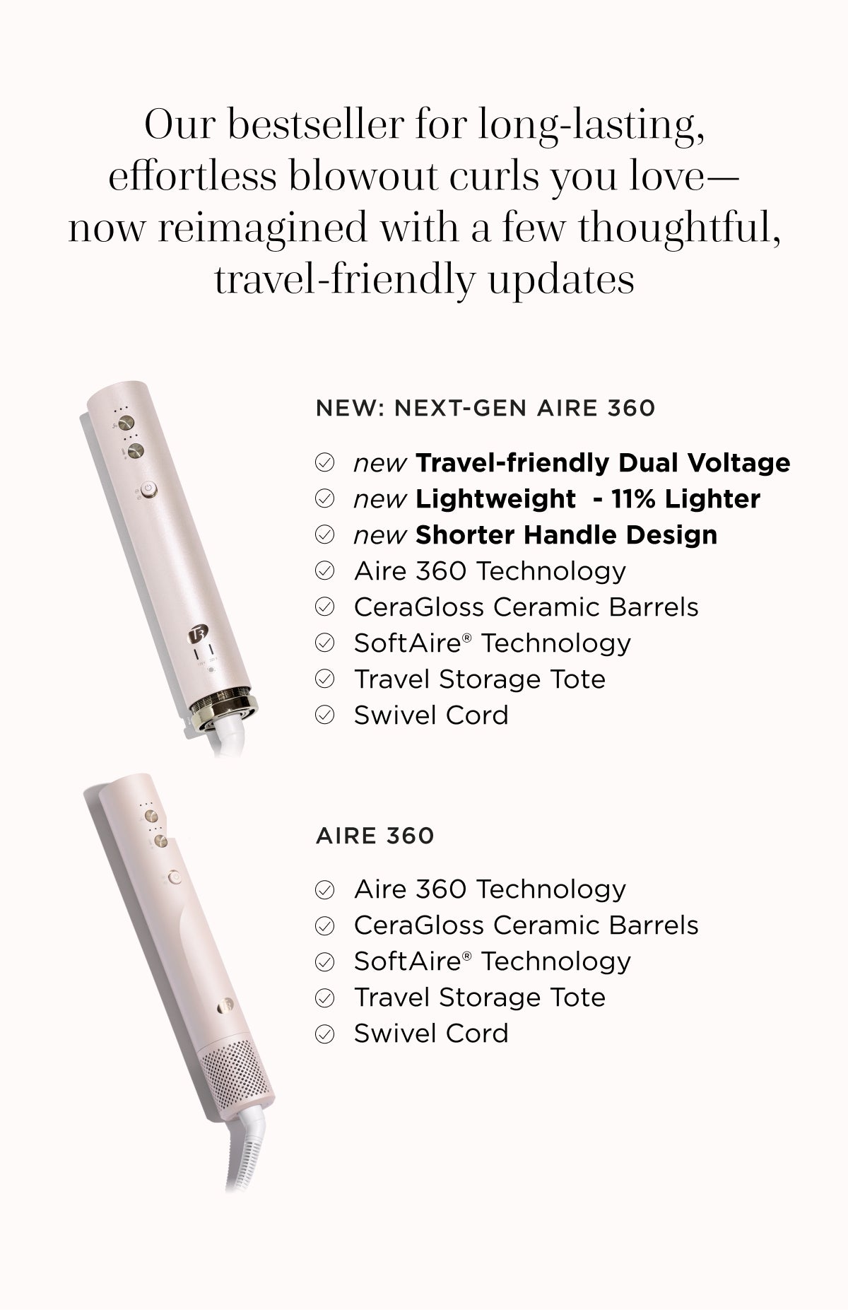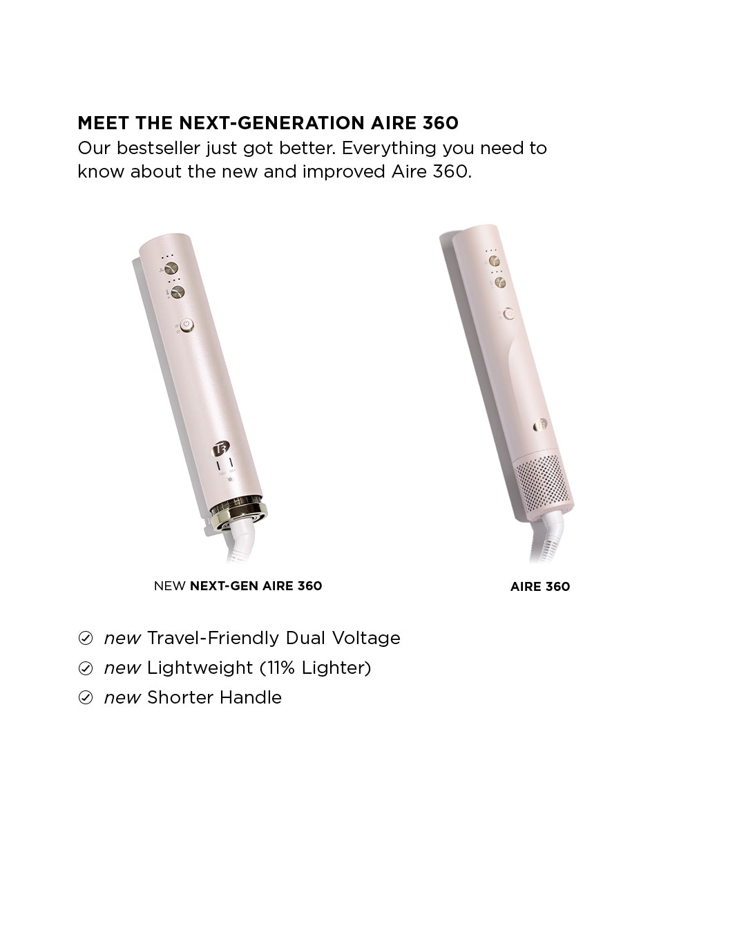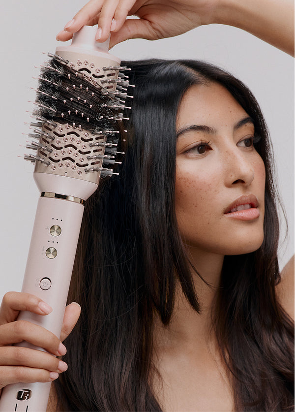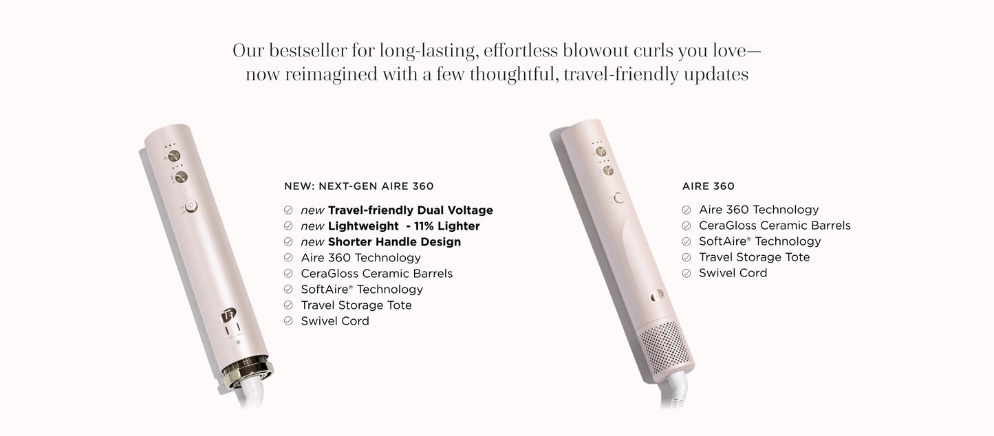 The new Aire 360 is our iconic bestseller—now reimagined for wherever you style. Designed to be more compact and travel-ready, this upgraded version features a shorter handle, lighter base, refined air intake and filter system, plus dual voltage for effortless styling anywhere in the world. Custom-blend CeraGloss™ ceramic attachments distribute heat evenly to help prevent hot spots, smooth the cuticle, enhance shine, and minimize damage—so your blowout looks glossier and lasts longer. Powered by T3 Aire 360 technology, it gathers hair to form curls using air for bouncy blowouts and lasting shape. Ceramic barrels lock in shine, the oval brush smooths and lifts, the SoftAire® drying concentrator delivers fast-yet-gentle drying.
